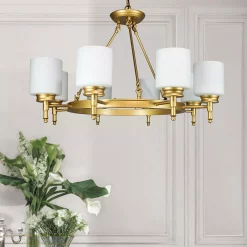 Cenports Antora Vintage Gold Wagon Wheel Light Fixture With Semi White Glass Shades, 8 Bulb, Elegant Overhead Lighting And Home Decor, Entryway, Dining Room, And Foyer