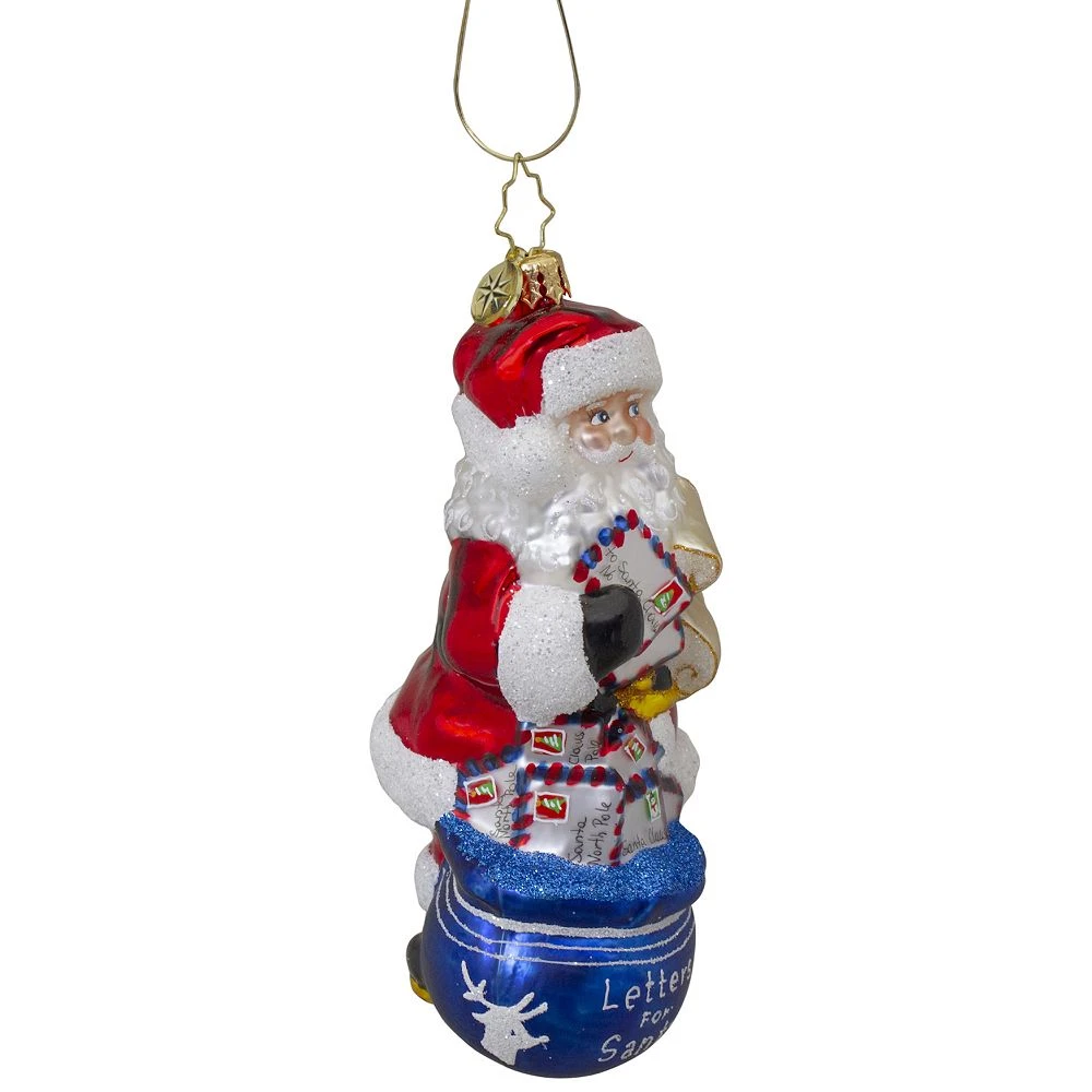 The Christopher Radko Company has been designing and producing fine European mouth-blown glass ornaments for more than a quarter of a century. Ornaments are produced in Europe by a seasoned team of artists and craftsmen many of whom have been with the company since its very inception. Each piece is meticulously crafted by hand using Renaissance-era carving molding glass blowing silver lining hand painting and finishing processes that require both unparalleled skill and several weeks to complete. Exquisite workmanship and handcrafted details are the hallmark of all Christopher Radko creations. Bring warmth color and sparkle into your home as you celebrate life’s heartfelt connections. More than just an ornament a Christopher Radko ornament is a work of heart!! Product Features: Santa with a sack of Christmas letters ornament. Ornament is embellished with shimmering glitter. Santa is wearing a traditional red and white suit. Holding letters for Santa and a naughty or nice list. Fully dimensional ornament. Comes ready-to-hang. Designed with a gold-colored hanging Christopher Radko emblem tag. Recommended for indoor decorative use only. Dimensions: 5H x 3W x 3D. Material(s): glass/glitter
