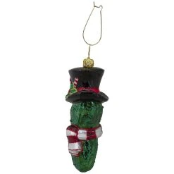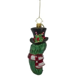 The Christopher Radko Company has been designing and producing fine European mouth-blown glass ornaments for more than a quarter of a century. Ornaments are produced in Europe by a seasoned team of artists and craftsmen many of whom have been with the company since its very inception. Each piece is meticulously crafted by hand using Renaissance-era carving molding glass blowing silver lining hand painting and finishing processes that require both unparalleled skill and several weeks to complete. Exquisite workmanship and handcrafted details are the hallmark of all Christopher Radko creations. Bring warmth color and sparkle into your home as you celebrate life’s heartfelt connections. More than just an ornament a Christopher Radko ornament is a work of heart!! Product Features: Shiny emerald green pickle ornament. Ornament is embellished with shimmering glitter. Pickle is wearing a black top hat and a striped scarf. Fully dimensional ornament. Comes ready-to-hang. Designed with a gold-colored hanging Christopher Radko emblem tag. Recommended for indoor decorative use only. Dimensions: 5H x 2W x 2D. Material(s): glass/glitter