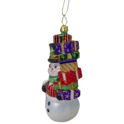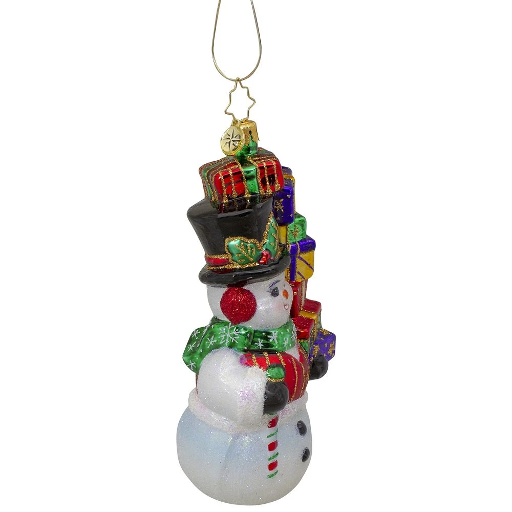 The Christopher Radko Company has been designing and producing fine European mouth-blown glass ornaments for more than a quarter of a century. Ornaments are produced in Europe by a seasoned team of artists and craftsmen many of whom have been with the company since its very inception. Each piece is meticulously crafted by hand using Renaissance-era carving molding glass blowing silver lining hand painting and finishing processes that require both unparalleled skill and several weeks to complete. Exquisite workmanship and handcrafted details are the hallmark of all Christopher Radko creations. Bring warmth color and sparkle into your home as you celebrate life’s heartfelt connections. More than just an ornament a Christopher Radko ornament is a work of heart!! Product Features: Snowman with stacked presents ornament. Ornament is embellished with shimmering glitter. Frosted snowman is wearing a black top hat and a snowflake scarf. Smiling snowman is holding many wrapped presents. Fully dimensional ornament. Comes ready-to-hang. Designed with a gold-colored hanging Christopher Radko emblem tag. Recommended for indoor decorative use only. Dimensions: 6H x 3W x 2.25D. Material(s): glass/glitter