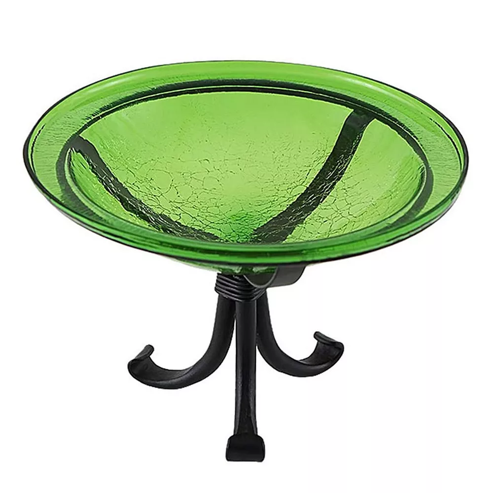 Add a touch of vibrancy, whimsy, and beauty to your garden, entrance walkway, or any outdoor space with the Hand Blown Crackle Glass Garden Birdbath with Tripod Stand in Green from Achla Designs.