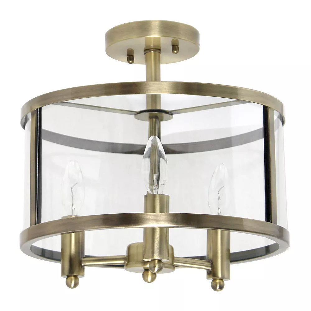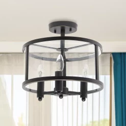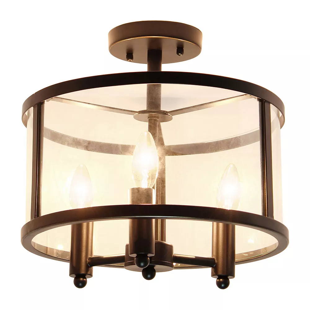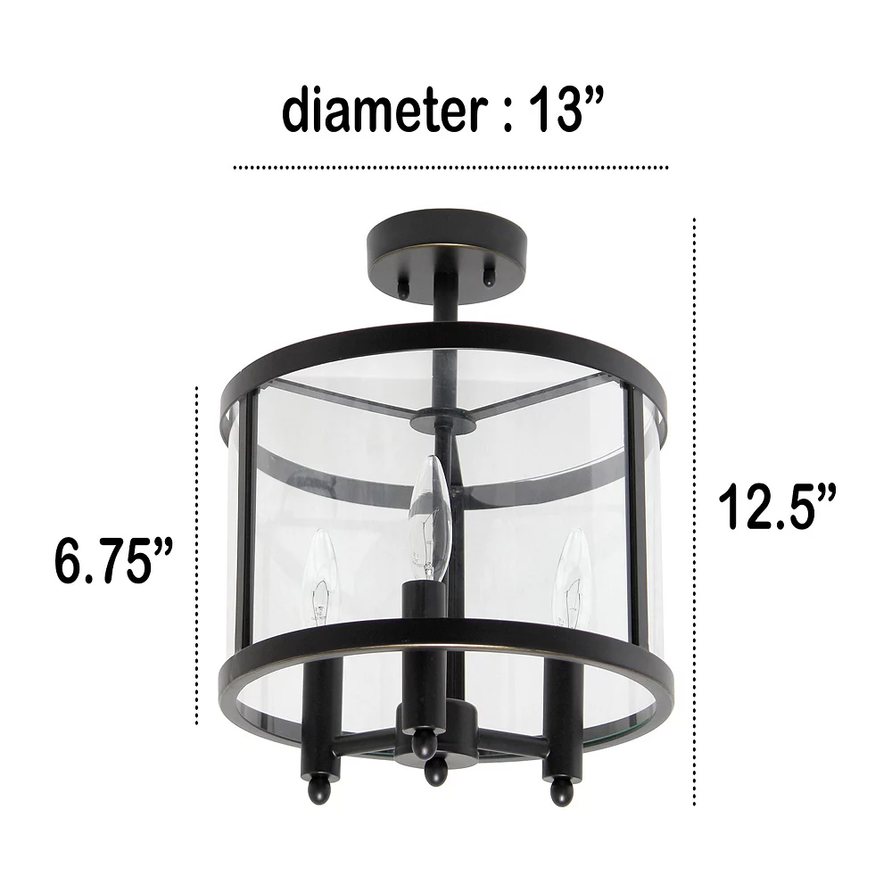 A mix of vintage and modern design brings you this beautiful, timeless semi-flushmount. The 3-light ceiling light is made of clear glass walls wrapped within an iron frame available in a variety of finishes to provide the ideal match for the space of your choice. This is the perfect piece to not only spruce up your decor, but the transparency of the fixture will surely illuminate your space in style. Beautifully crafted glass fixture with matte black metal frame. Hardwired fixture: minimal assembly and installation required. 13 bottom shade opening. Requires 3 x 40 watt E12 candelabra base B10 bulbs (not included). for full vintage look, an Edison bulb is recommended. Canopy to bottom of flushmount measures 12.5. Assembly required. Base Type: E12 Candelabra. Canopy Dimensions: L: 4.75 x W: 4.75 x H: 0.75. Overall Minimum height: 12.5. Overall Maximum height: 12.5. Suspension length: 3.125. Bulb Included: No. Does the item contain wood: No. Replacement Parts Available: Yes.