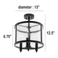 - Product Dimensions: 13″L x 13″W x Semi-flush: 6.75; Canopy to bottom of semi-flush: 12.5″H. Product Weight: 5.4 lbs. Finish/Color: Black. Primary Material: Glass