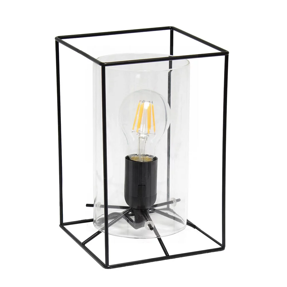 This table lamp features a black metal frame with a clear glass shade that will illuminate any room in style. The simple, clean lines of the frame is complimented by the rounded cylinder shade offering a chic sophisticated look. Perfect for your living room, bedroom, office, apartment or college dorm. HELPFUL TIP: To get the complete industrial look, we recommend using a decorative Edison/Vintage bulb (not included). Material Breakdown: GLASS 60%, Iron 40%, Easily accessible ON/OFF switch located on the cord. Shade Material : Fabric. Cord Color: Clear. Maximum Wattage: 40. Shade Material : Glass.