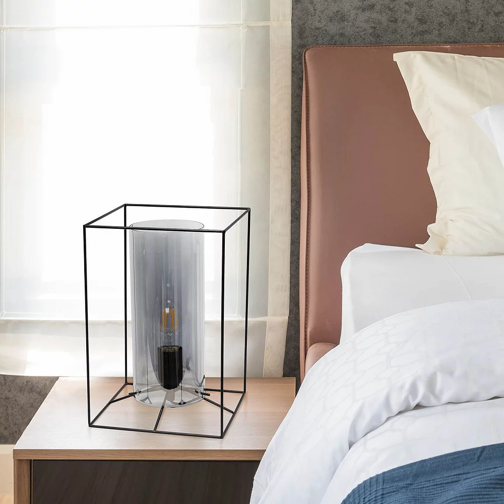 - Cylindrical smokey glass shade. Rectangular black metal frame. Style: Contemporary. Finish/Color: Black/Smoke. Primary Material: Metal.