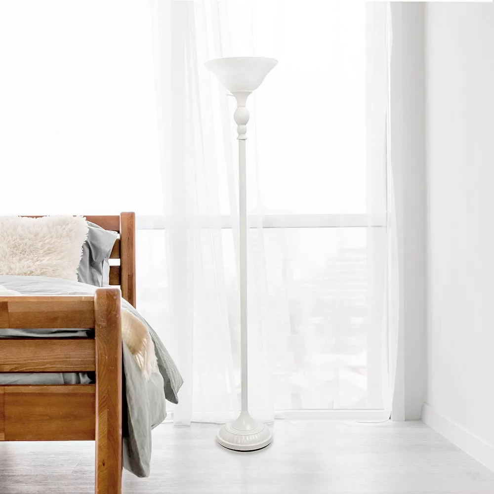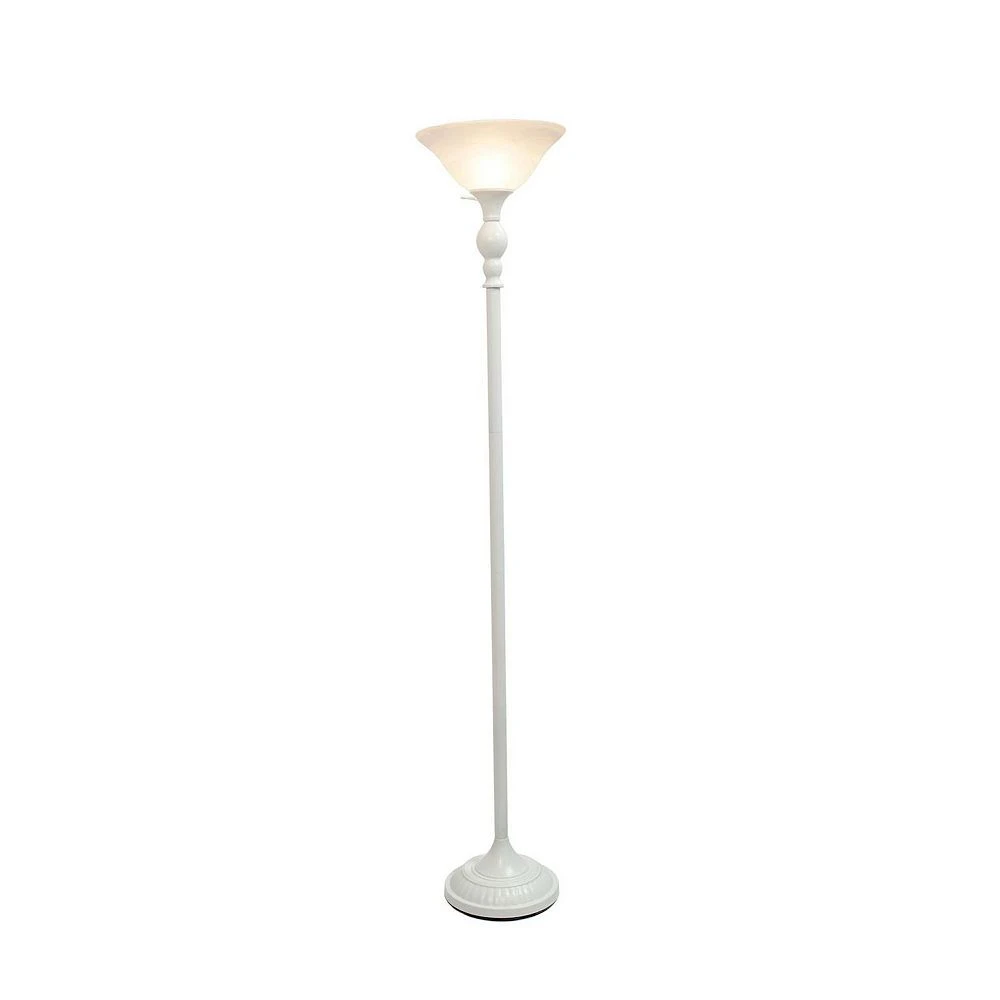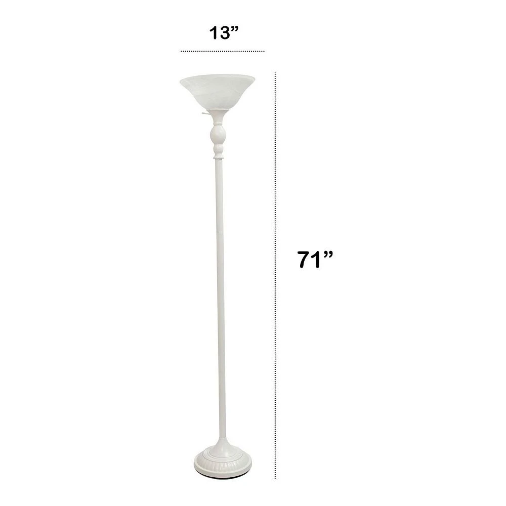 Light up your space with this simple but timeless torchiere floor lamp. It features a marbleized glass shade on a stunning metal base for a clean, sophisticated look. Perfect for your bedroom, office, foyer or living room.