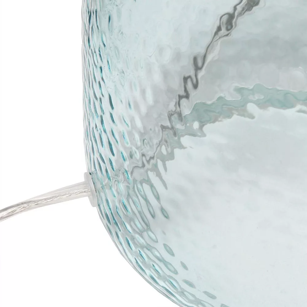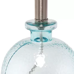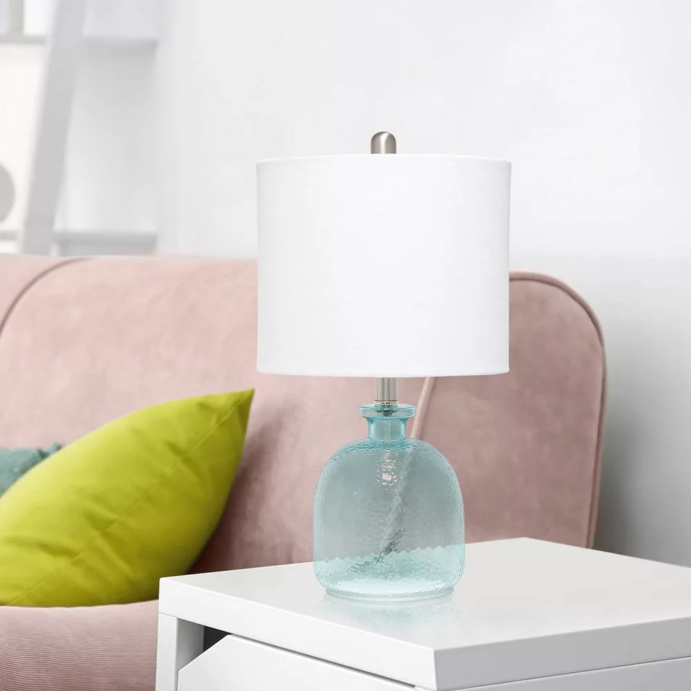 With a textured glass base and white fabric drum shade, this lamp is sure to update any room in your home with a little charm. This lovely lamp is crafted with an open bottom glass base in a clear blue color. Perfect for adding the little refresh to your living room, bedroom, foyer or office that you’ve been looking for. Material Breakdown: 48%, Fabric, 48%, glass, 3%, metal, 1% plastic, Easily accessible rotary switch located on the socket.