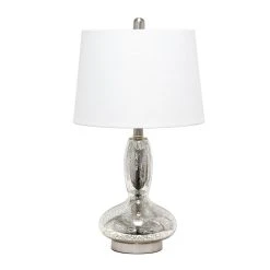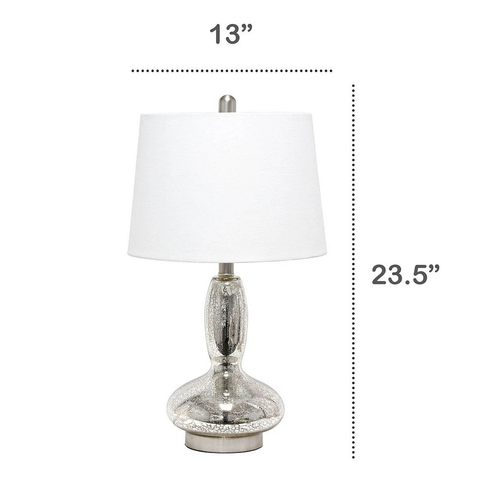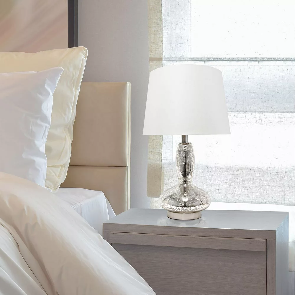 A beautiful lighting solution versatile enough for any room in your home, this contemporary lamp features a mercury glass base topped with a white fabric shade. Simplicity and style at its best. Perfect for your living room, bedroom, office, or anywhere you need to add a tasteful update. Material Breakdown: 48%, Fabric, 48%, glass, 3%, metal, 1%. plastic Easily accessible rotary switch located on the socket.