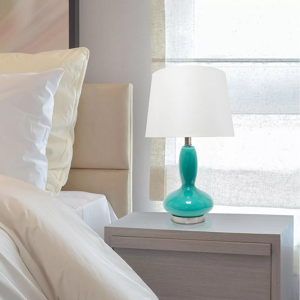 A beautiful lighting solution versatile enough for any room in your home, this contemporary lamp features a teal glass base topped with a white fabric shade. Simplicity and style at its best. Perfect for your living room, bedroom, office, or anywhere you need to add a tasteful update. Material Breakdown: 48%, Fabric, 48%, glass, 3%, metal, 1% plastic. Easily accessible rotary switch located on the socket.
