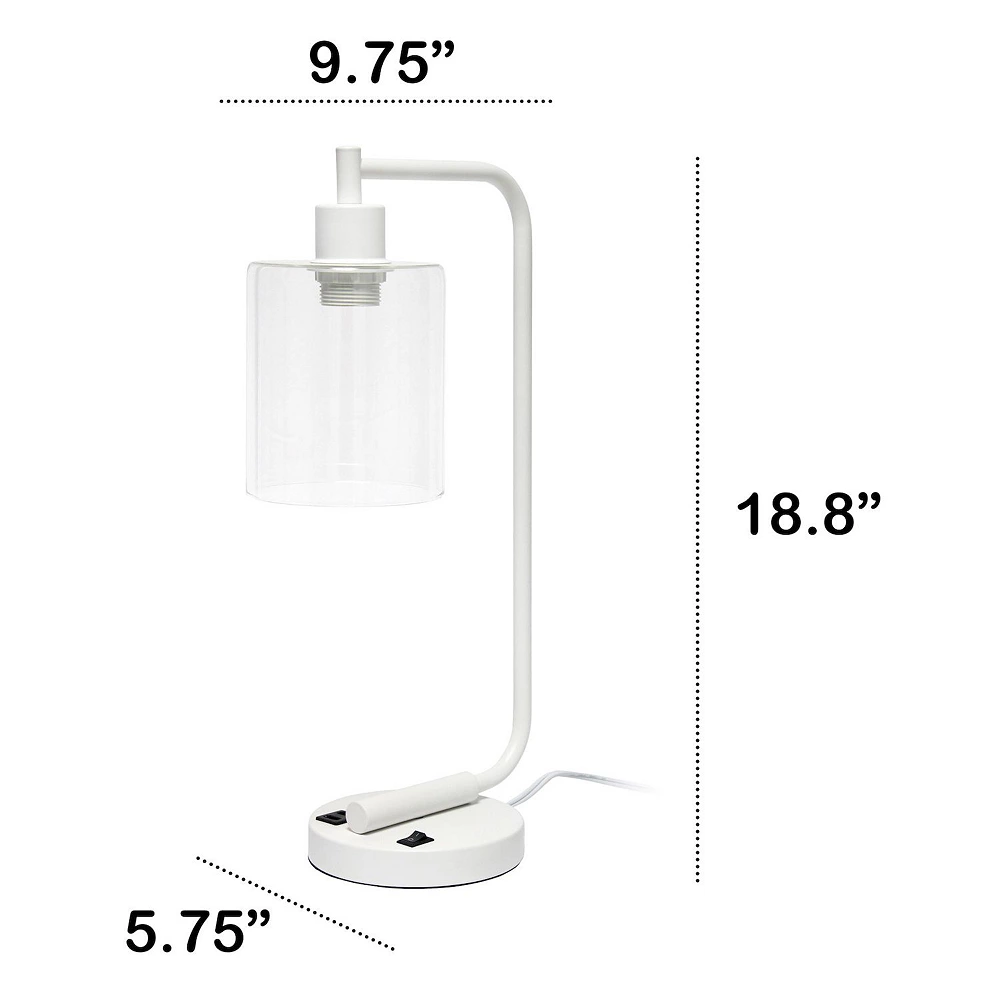 Simple yet modern, this desk lamp is sure to add a touch of style to any room in your home. This beautifully crafted iron desk lamp combines a simple base with a curved arm, (2) USB ports, and a clear cylinder glass shade for a sleek and sophisticated combination. Perfect for your desk, foyer or bedside table for a modest, refined look in trendy lighting. **HELPFUL TIP: To get the complete industrial look, we recommend using a decorative Edison/Vintage bulb (not included). **