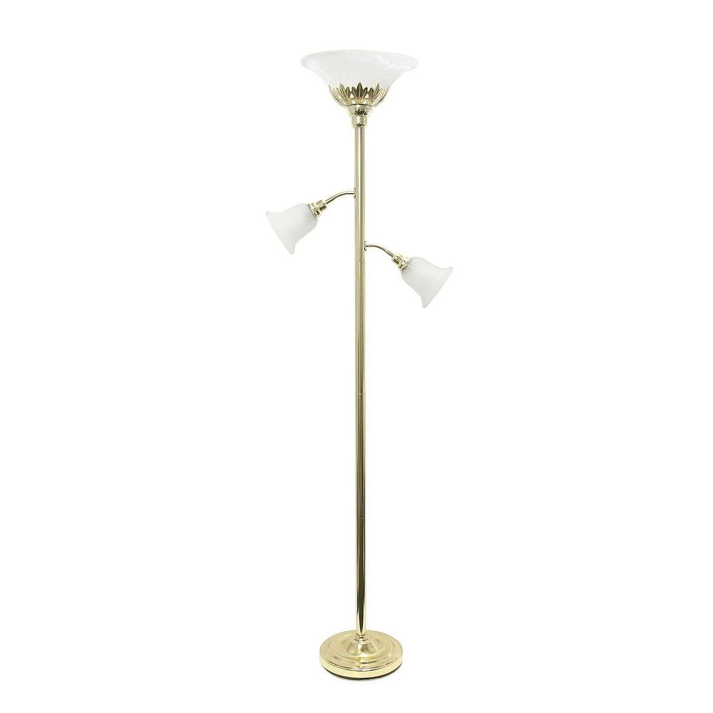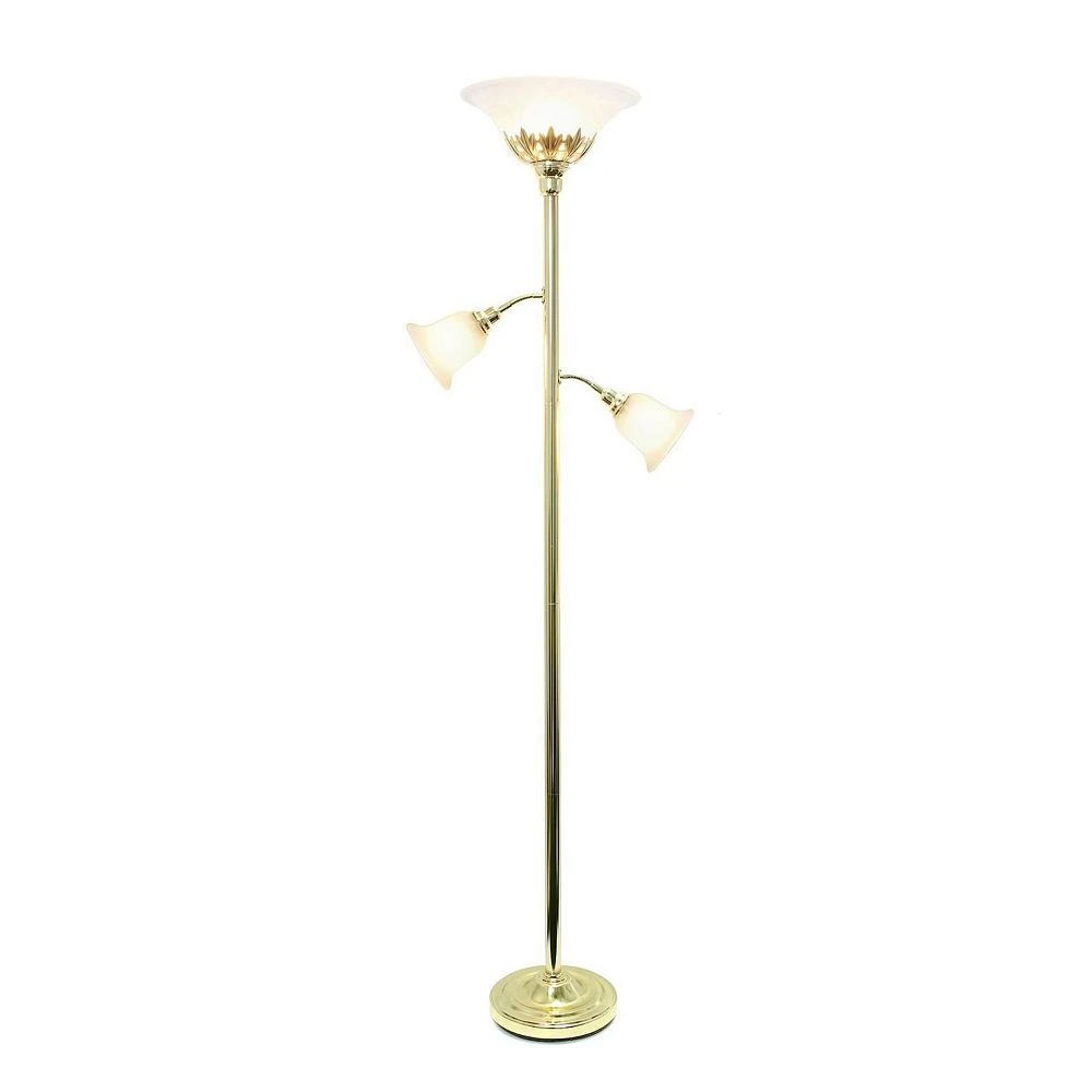 Brighten up your living space with this elegant 3 light floor lamp. It features 2 adjustable reading lights to focus on the area of your choice. The beautiful metal base is accented by scalloped glass shades to complete the timeless look. Perfect for your bedroom, office, foyer or living room!