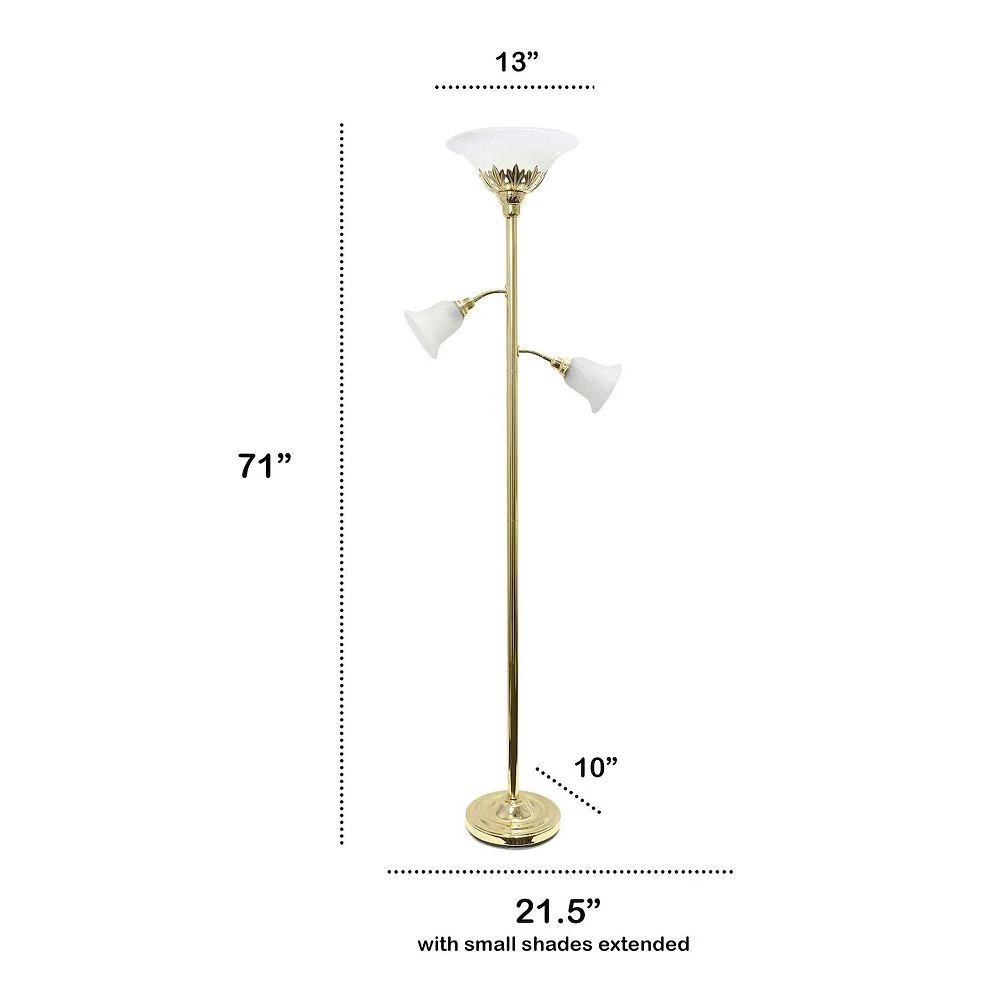 - Style: Traditional. Finish/Color: Gold/White Shades. Primary Material: Metal. 70% Iron, 25% Glass, 5% Others. Base Type: E26 Medium Base. Base Dimensions: base diameter: 10.5″ Height 67″. Height from Base to Shade: Top: 66″. Middle: 55.5″. Bottom: 49.5″. Bulb Included:No