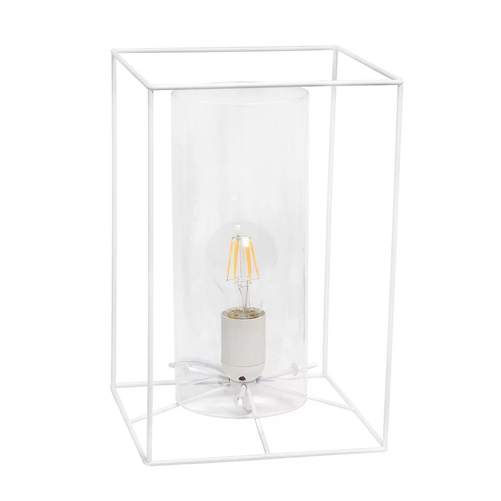 This table lamp features a white metal frame with a clear glass shade that will illuminate any room in style. The simple, clean lines of the frame is complimented by the rounded cylinder shade offering a chic sophisticated look. Perfect for your living room, bedroom, office, apartment or college dorm. HELPFUL TIP: To get the complete industrial look, we recommend using a decorative Edison/Vintage bulb (not included). Material Breakdown: GLASS 60%, Iron 40%, Easily accessible ON/OFF switch located on the cord. Shade Bottom Opening: 4.25. Shade Height/Slant: 10.25. Shade Security: Twist Pin. Shade Shape: Cylinder.