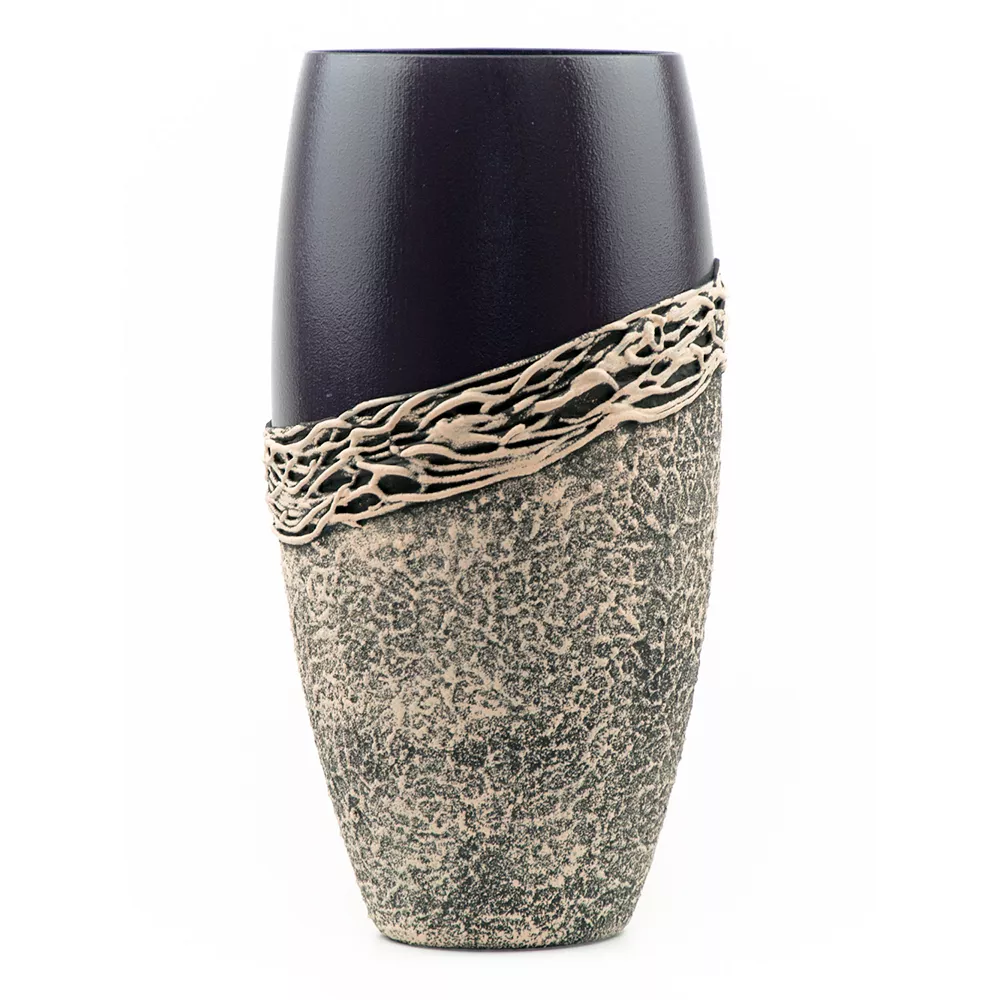 Elevate your space with this decorative flower vase. This table barrel vase showcases an artisanal quality with abstract designs brilliantly hand-painted on it. Keep your decor fresh with this flower vase on your dining room table or mantel. You can also pair it with matching vases to create a stunning centerpiece of rustic beauty. Product Features: Black and beige barrel vase. Abstract pattern. Hand painted with high quality materials. Recommended for indoor use only. Made in Belarus. Care instructions: wipe clean with a dry or damp sponge; do not use detergents or abrasive products. Dimensions: 11.75 high x 6.25 diameter. Material(s): glass