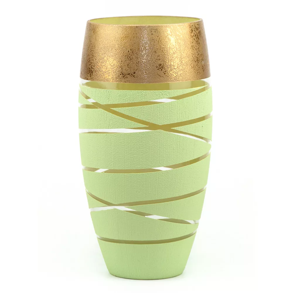 If you are looking for an elegant piece of art to accent your modern decor this glass vase will do it beautifully for you. This barrel vase is beautifully hand-painted in soft hues and embellished at the rim with a broad golden band with delicate detailing. You could use it as a decorative table piece or for displaying your favorite flowers. Product Features: Green and gold barrel vase. Minimalist style. Hand painted with high quality materials. Recommended for indoor use only. Made in Belarus. Care instructions: wipe clean with a dry or damp sponge; do not use detergents or abrasive products. Dimensions: 11.75 high x 6.25 diameter. Material(s): glass