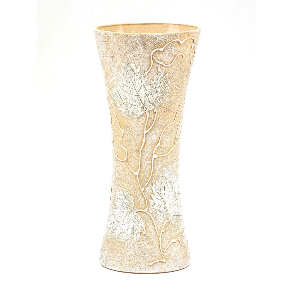 Allow your gaze to be drawn to the exquisite elegance of this lovely flower vase. The frosted leaf pattern against a light background will breathe fresh life into your living areas. It’s a quick and easy way to add a brilliant focal point to any area either alone or as part of a bouquet. Product Features: Beige and cream tabletop vase. Frosted leaf pattern. Hand painted with high quality materials. Recommended for indoor use only. Made in Belarus. Care instructions: wipe clean with a dry or damp sponge; do not use detergents or abrasive products. Dimensions: 11 high x 4.75 diameter. Material(s): glass