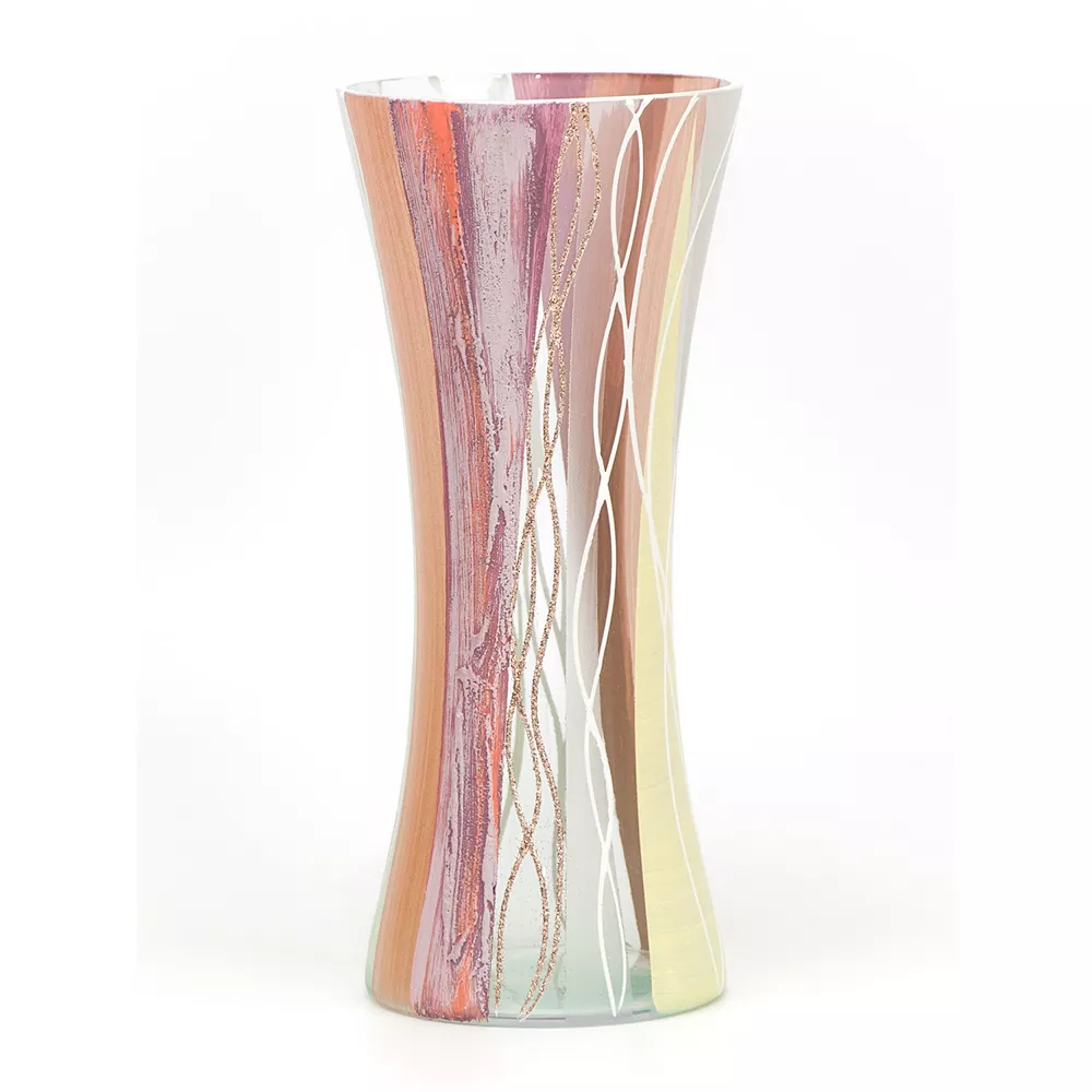 This wonderful art-decorative vase is all you need to make your abode beautiful. The accent is enhanced with vertical lines that bring clarity geometricity and balance to the interior. It is coupled with the quality of standard materials making this hand-painted addition a matter of excellence. Place this fabulous addition in your bedroom living room dining area and more. Product Features: Orange and yellow tabletop vase. Vertical lines design. Hand painted with high quality materials. Recommended for indoor use only. Made in Belarus. Care instructions: wipe clean with a dry or damp sponge; do not use detergents or abrasive products. Dimensions: 11 high x 4.75 diameter. Material(s): glass