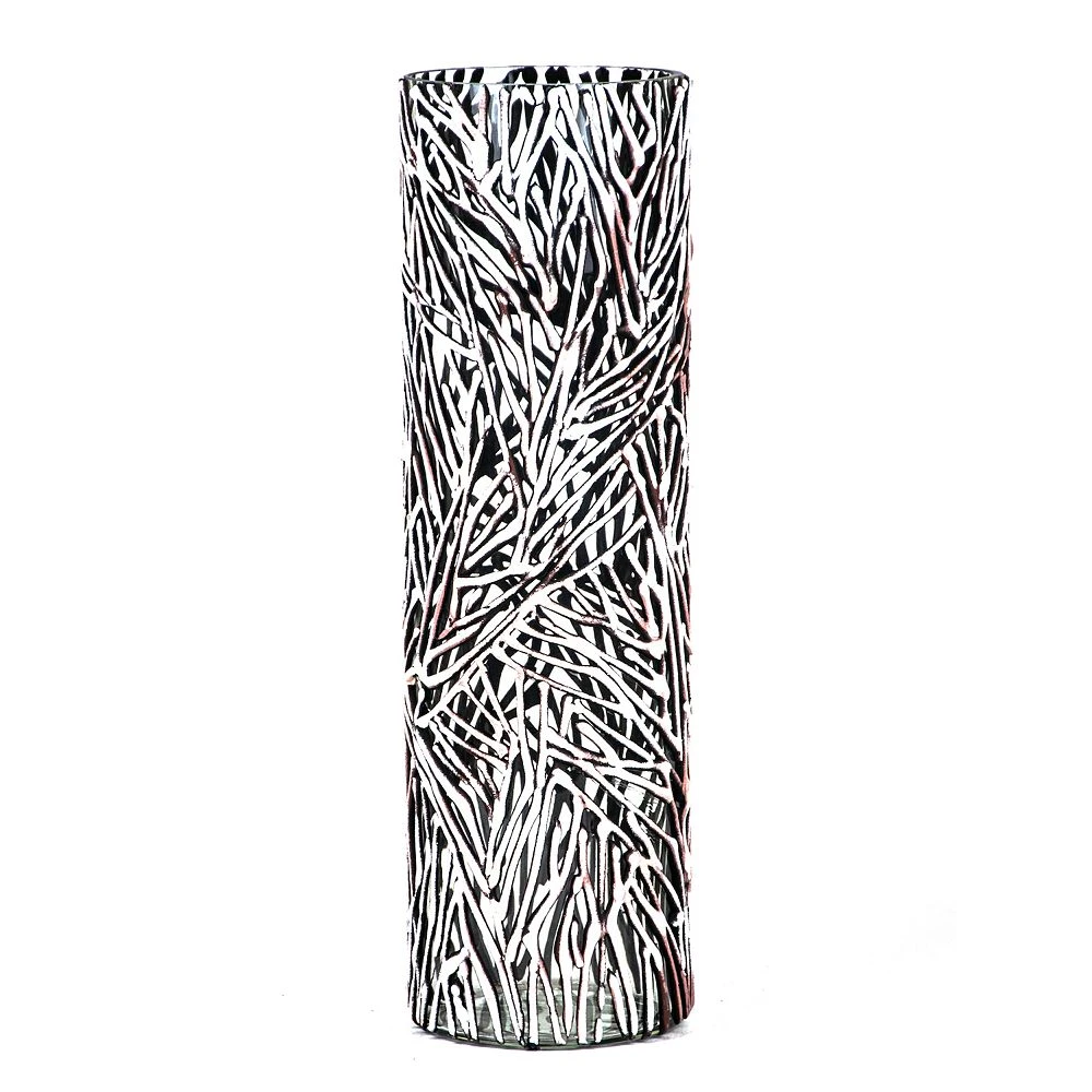 Office or home this incredible and eye-catching art decorative cylindrical vase is sure to stun. This accent showcases branches of bushes and trees which is synonymous with graceful weave flexibility and strength. Nothing can match the beauty of this hand-painted vase placed on your table desk and more. Product Features: Brown and clear cylindrical vase. Branches of bushes design. Hand painted with high quality materials. Recommended for indoor use only. Made in Belarus. Care instructions: wipe clean with a dry or damp sponge; do not use detergents or abrasive products. Dimensions: 15.75 high x 4.75 diameter. Material(s): glass