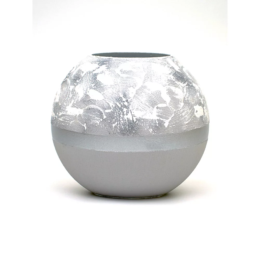 This decorative vase is stylish and eyecatching. It has a classical round glass bowl shape that is hand-painted with high-quality materials. While it has a plain base the upper half has brushstrokes in various shades of gray that reflect light differently based on the lighting. A lustrous band running through its center gives it an elegant finish. This beautiful vase will add sophistication and artistry to your modern decor effortlessly. It is the ideal decor to display your favorite flowers on your console table or mantle. Product Features: Gray and white round vase. Brushstrokes design. Hand painted with high quality materials. Recommended for indoor use only. Made in Belarus. Care instructions: wipe clean with a dry or damp sponge; do not use detergents or abrasive products. Dimensions: 6.25 high x 7 diameter. Material(s): glass
