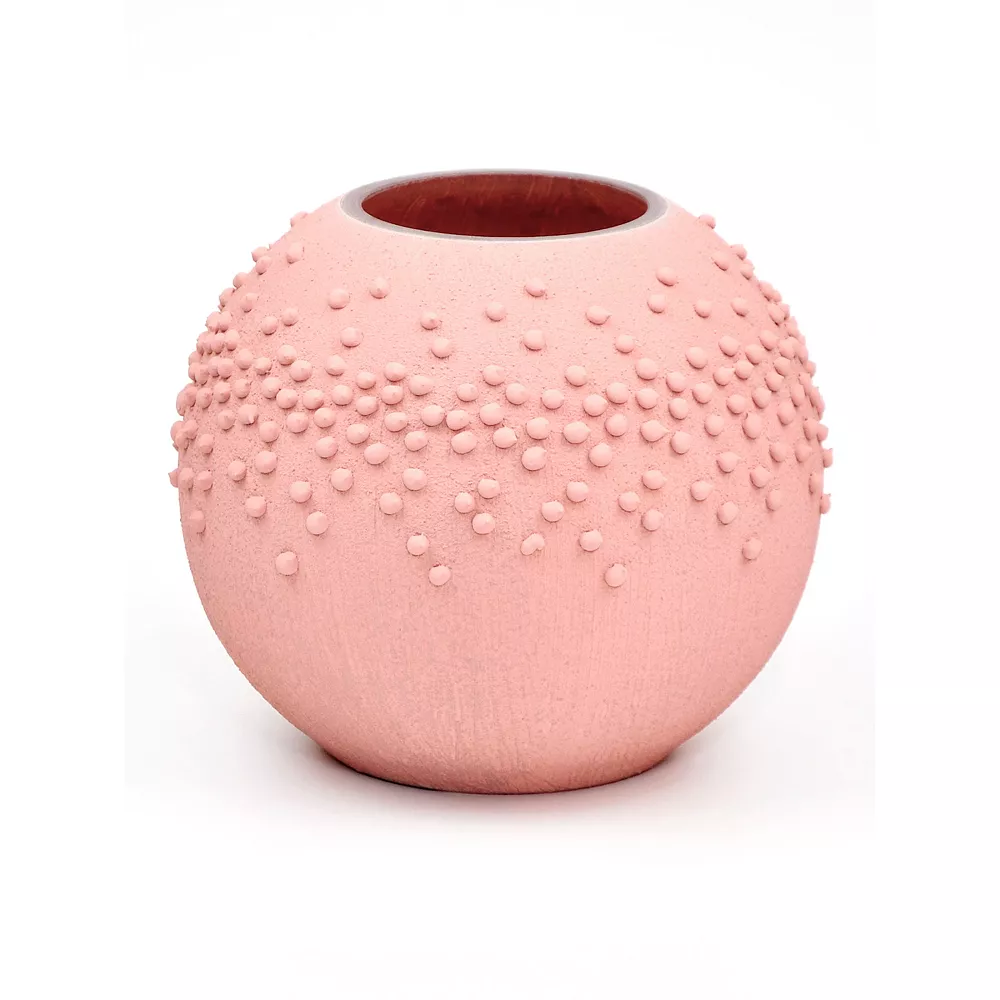 Your living space will become a place of serenity and calm with the soothing color of this decorative glass vase. This round vase has a hand-painted minimalist design that is elevated by the playful texture of small dotted pops. Leave it on your table or mantle to give it an attractive edge and add some flowers to set the mood. Product Features: Pink dotted round vase. Minimalist style. Hand painted with high quality materials. Recommended for indoor use only. Made in Belarus. Care instructions: wipe clean with a dry or damp sponge; do not use detergents or abrasive products. Dimensions: 6.25 high x 7 diameter. Material(s): glass