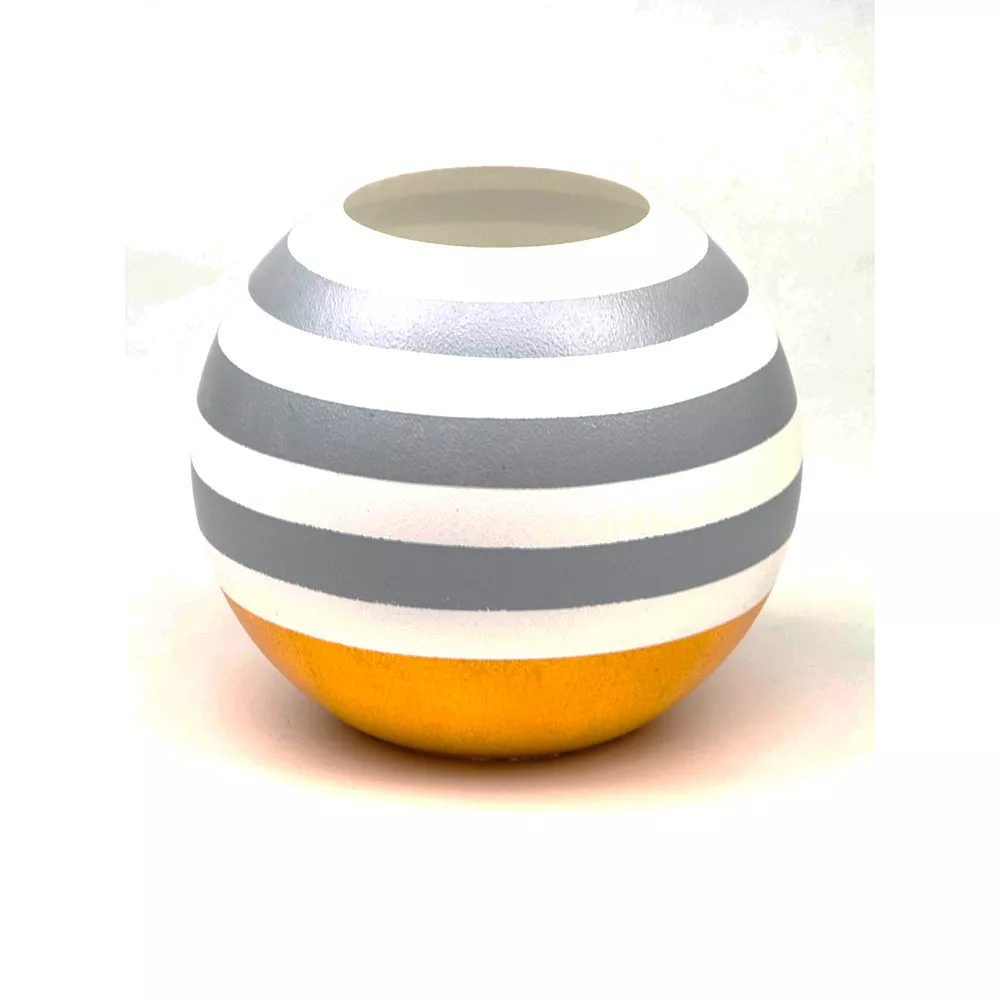 This decorative vase will enhance your modern styling with its minimalist design and beautiful contrasts. The brilliant color of the base of this round glass vase is perfectly balanced by the soft contrasting stripes around its body. The silver color adds glitz to the design. Hand-painted with excellence it gives you a great stage for your flower display. Product Features: Yellow and white round vase. Horizontal striped pattern. Hand painted with high quality materials. Recommended for indoor use only. Made in Belarus. Care instructions: wipe clean with a dry or damp sponge; do not use detergents or abrasive products. Dimensions: 6.25 high x 7 diameter. Material(s): glass