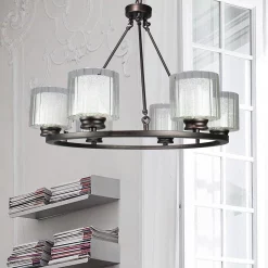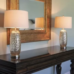 - Shade sits atop a sleek metal base that is finished in shimmery silver