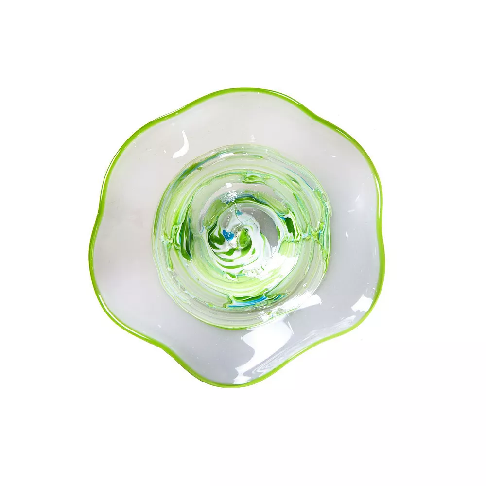 - Hand blown in concentric waves of green in the middle on a white background