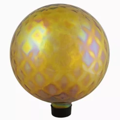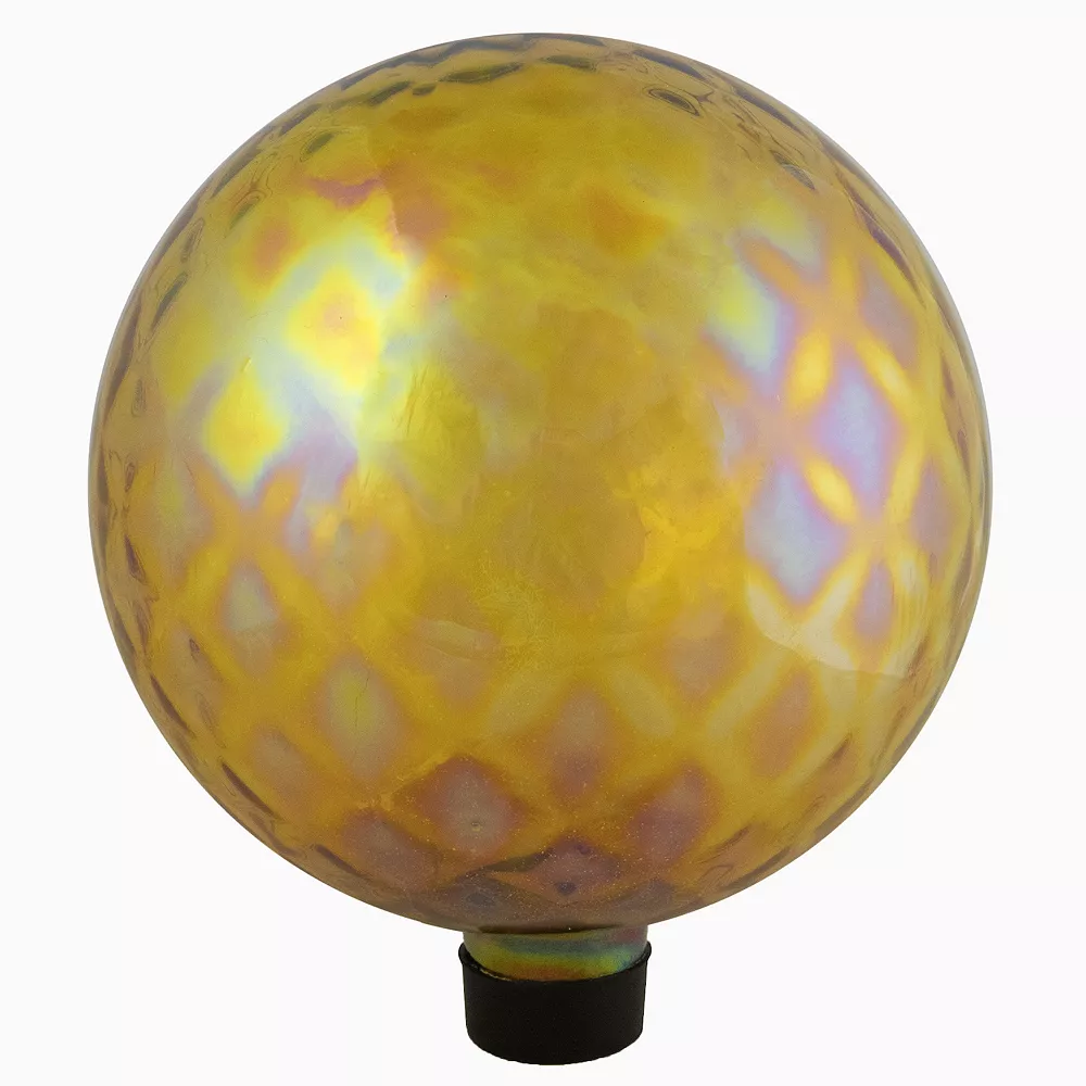 Thought to attract fairies and magical beings gazing balls have been making gardens beautiful since the 13th century. Designed with a stemmed bottom with a rubber cap making it easier to place into a stand (please note this gazing globe does not include a stand; the stand must be purchased separately). This versatile piece is the perfect way to add style and charm to your garden. Product Features: Amber gazing ball. Reflective iridescent finish. Dimpled style pattern. Stand not included. Recommended for indoor and outdoor use. Dimensions: 10 diameter. Material(s): glass