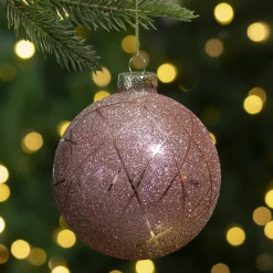This ornament will be sure to add bold and glamorous style to your home holiday decor. It features a shiny glitter finish with striped lines etched into the finish. Great for use on trees wreaths in centerpieces or as decoration in glass bowls. Product Features: Color: rose gold. Finish: shiny and glitter. Ornament has an etched stripe pattern. Comes equipped with a gold ornament cap and string. Recommended for indoor decorative use only. Dimensions: 4 (100mm) diameter. Material(s): glass