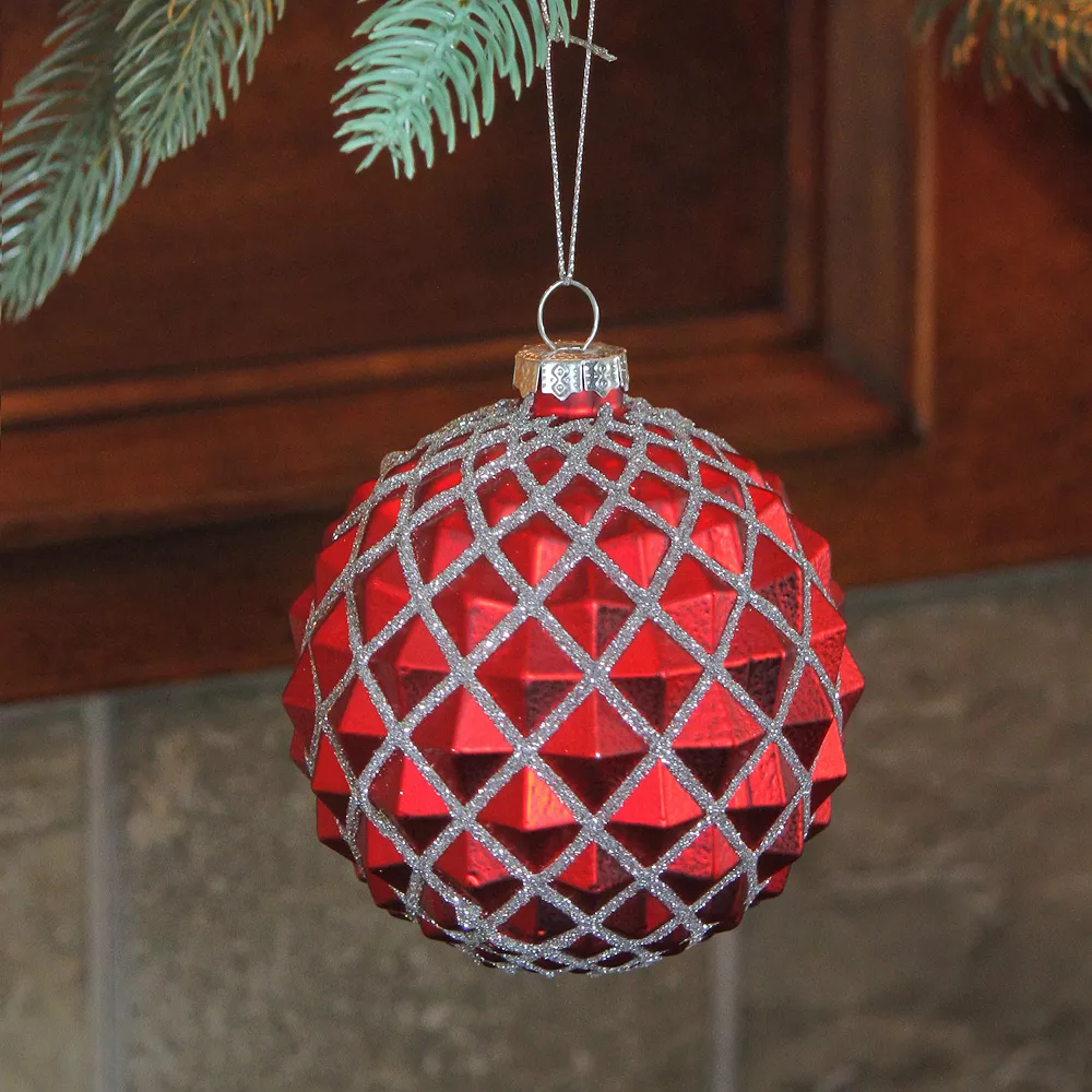 Looking for an elegant take on a Christmas classic? This ornament has a geometric design and is accented in silver glitter. This ornament will add a little sparkle to your tree your mantle window or anywhere you wish to add a little bit of flair. Product Features: Glittered red glass ball ornament. Features a geometric ball with silver glitter accents. Comes with a silver ornament cap and cord. Recommended for indoor use only. Dimensions: 3.25 diameter. Material(s): glass