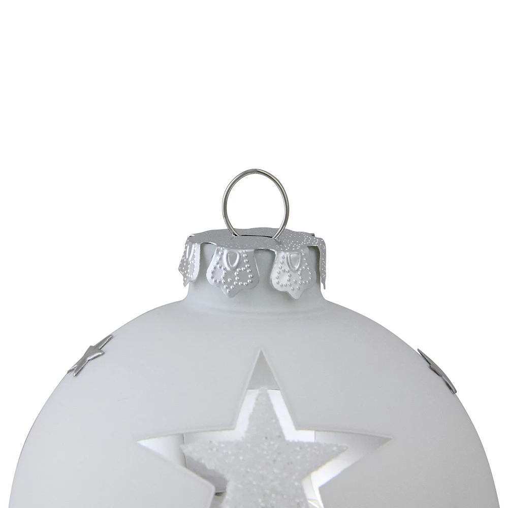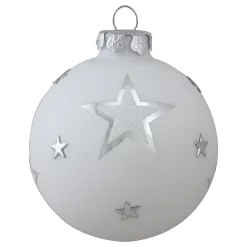 From the Winter’s Bloom Collection. This frosted silver ornament would be a fun and cool addition to your holiday decor. Featuring frosted glass ornament with silver stars decorating what looks like a frosted background. Glitter accents. Fully dimensional ornament. Comes ready to hang on a silver string. Dimensions: 3.25D. Material(s): plastic