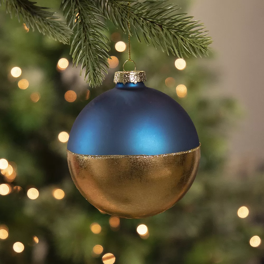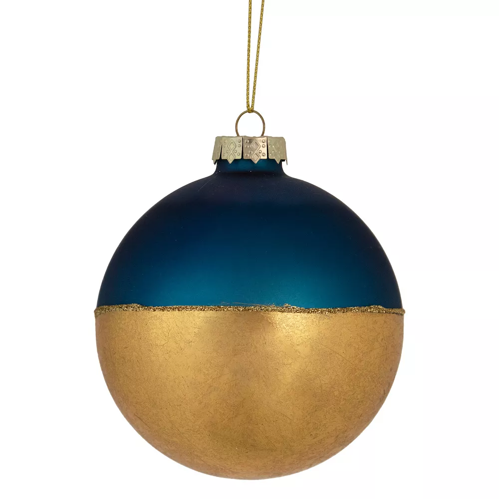 Glass ball ornaments are one of a kind! A classic shape with fresh designer colors these ball ornaments will allow you to build your collection quickly and decorate with more possibilities. These matte blue and gold foil-like designed ornaments with a pop of glitter are great for Christmas and all the way through the New Year. >Product Features: Color: blue and gold. Finish: matte and shiny. Equipped with a gold ornament cap. Comes ready-to-hang on a gold cord. Dimensions: 3.5 in diameter. Materials: glass