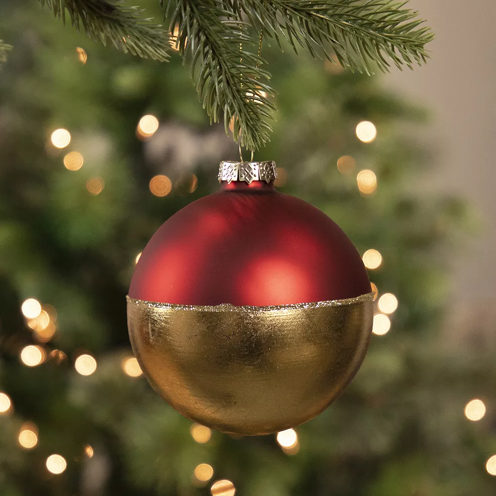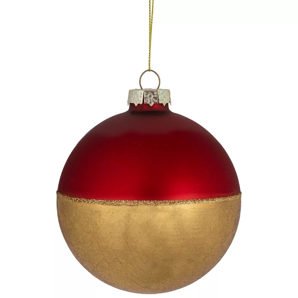 Glass ball ornaments are one of a kind! A classic shape with fresh designer colors these ball ornaments will allow you to build your collection quickly and decorate with more possibilities. These matte red and gold foil-like designed ornaments with a pop of glitter are great for Christmas and all the way through the New Year. >Product Features: Color: red and gold. Finish: matte and shiny. Equipped with a gold ornament cap. Comes ready-to-hang on a gold cord. Dimensions: 3.5 in diameter. Materials: glass