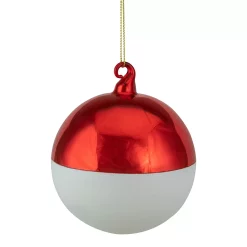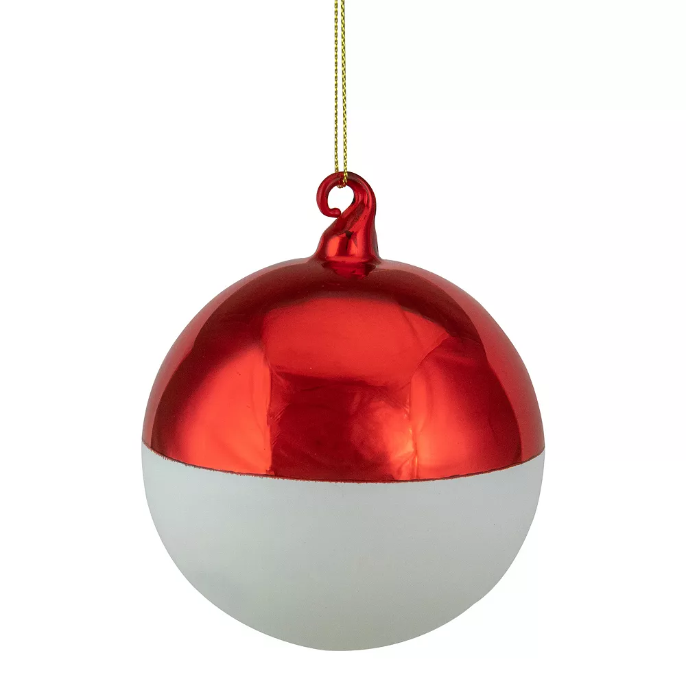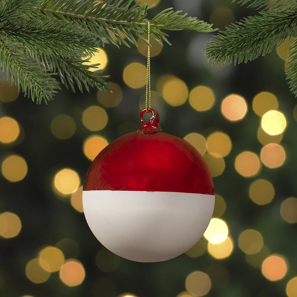 This simple glass ornament will add a pop of color to your holiday collection. The ornament is designed with a shiny red and matte white finish. You can add this to your Christmas tree hang from mantles or give it as a present to that special person on your list. Product Features: Red and white glass ball Christmas ornament. Features shiny red and matte white finishes. Fully dimensional ornament. Attached to a gold string for easy hanging. For indoor use only. Dimensions: 3.5 diameter. Material(s): glass