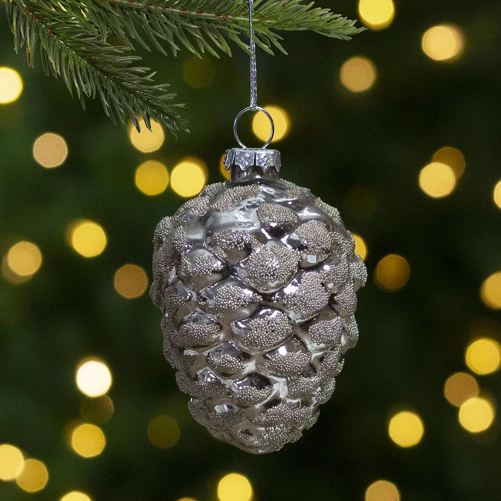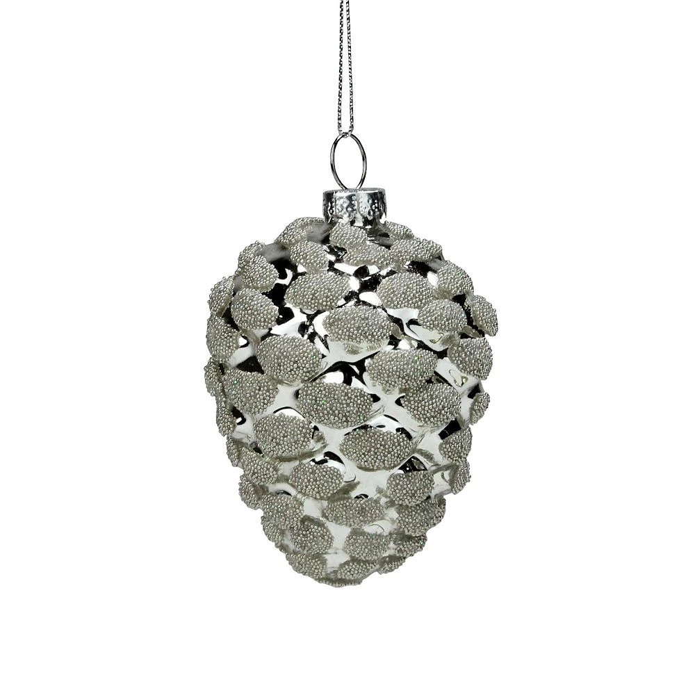 This beautiful flower glass ornament has a three-dimensional popping design. With a shiny cord for hanging the decor piece is excellent for decorating trees garland and wreaths. It brings in a creative twist to your festive theme. Product Features: Silver pine cone hanging Christmas ornament. Accented with mini silver beads on it. Silver embossed cap. Comes ready-to-hang on a silver cord. Recommended for indoor decorative use only. Dimensions: 3.25 high x 2.5 diameter. Material(s): glass