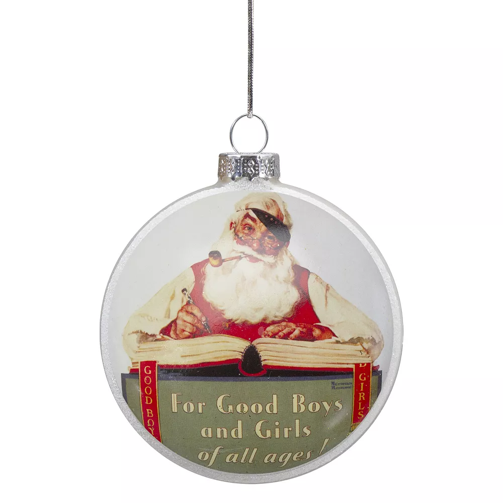 - Silver Norman Rockwell ‘No Christmas Problem Now’ glass disc ornament
