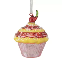 Add the sweet treat of a frosted cupcake to your tree with this glass Christmas ornament. The red and yellow frosting stripes are adorned with white sprinkles and swirling stripes giving it a delicious look. This is perfect for your Christmas tree restaurant coffee or candy shop! Features: Glass cupcake Christmas ornament. Red and yellow frosting covered cupcake. Metallic red frosting. Red frosting has white swirls. Yellow frosting has white sparkling glitter. Silver cupcake base. Topped with a glass cherry. Fully dimensional ornament. Comes ready to hang on a white ribbon. Recommended for indoor use only. Dimensions: 3H x 2.25W x 2.25D. Material(s): glass