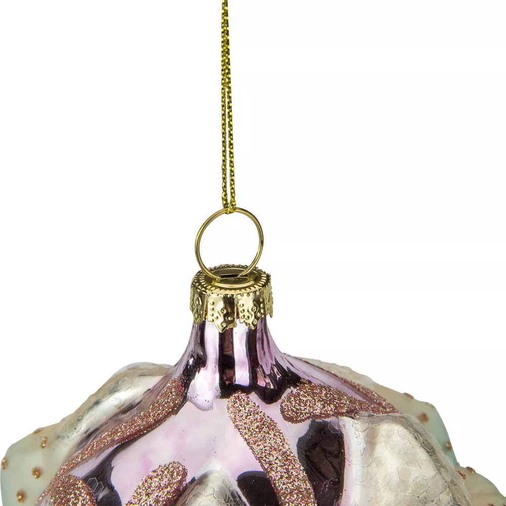 Add this beautiful flower ornament to your holiday decor for a special pastel pop! Pink glass bursts into minty green flowers. Rose gold glitter adds the perfect amount of sparkle. A perfect addition to your tree from season to season. Fully dimensional ornament. Comes ready-to-hang on a gold cord. For indoor use only. Dimensions: 4.25H x 4W x 4D. Materials: glass
