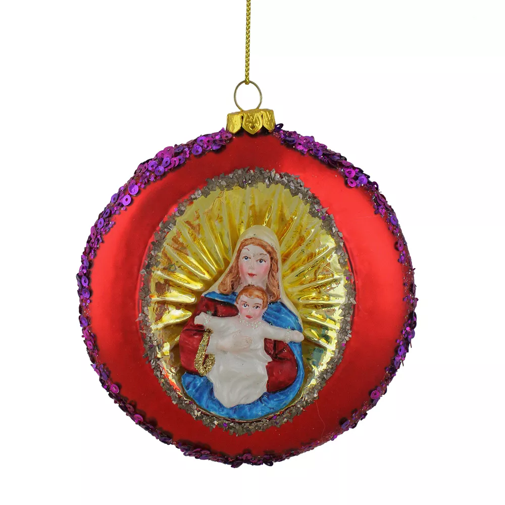 Represent your faith with this beautiful Mary and Baby Jesus ornament. It will keep you in the Christmas spirit all season while adding a pops of color. Hang from Christmas trees or use in nativity displays. Product Features: Red disc Christmas ornament. Depicts Mary holding Baby Jesus. Embellished with gold sequins; gold glitter. Fully dimensional ornament. Comes ready-to-hang on a gold cord. Recommended for indoor use only. Dimensions: 1.25 high x 4 diameter. Material(s): glass