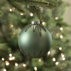 Glass ball ornaments are one of a kind! A classic shape with fresh designer colors this ball ornament will allow you to build your collection quickly and decorate with more possibilities. This matte green ornament with a glittered starburst designs is great for Christmas and all the way through the New Year. Product Features: Color: green. Finish: matte. Glittered starburst designs. Equipped with a gold ornament cap. Comes ready-to-hang on a gold cord. Dimensions: 4 in diameter. Material(s): glass/metal
