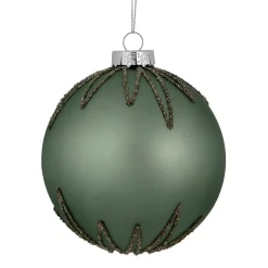 Glass ball ornaments are one of a kind! A classic shape with fresh designer colors this ball ornament will allow you to build your collection quickly and decorate with more possibilities. This matte green ornament with a glittered starburst designs is great for Christmas and all the way through the New Year. Product Features: Color: green. Finish: matte. Glittered starburst designs. Equipped with a gold ornament cap. Comes ready-to-hang on a gold cord. Dimensions: 4 in diameter. Material(s): glass/metal