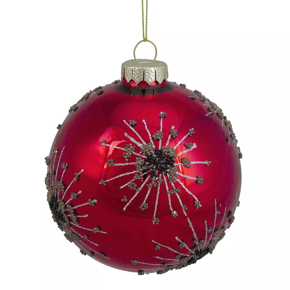 Looking for an elegant take on a Christmas classic? This ornament has a bursting snowflake design in silver gold and brown and is accented in glitter. This ornament will add a little sparkle to your tree your mantle window or anywhere you wish to add a little bit of flair. Product Features: Red Christmas ball ornament. Features bursting snowflakes colored silver gold and black. Accented with beads and glitter. Comes ready-to-hang with a gold ornament cap with cord. For indoor decorative use only. Dimensions: 4 inches in diameter. Material(s): glass/plastic