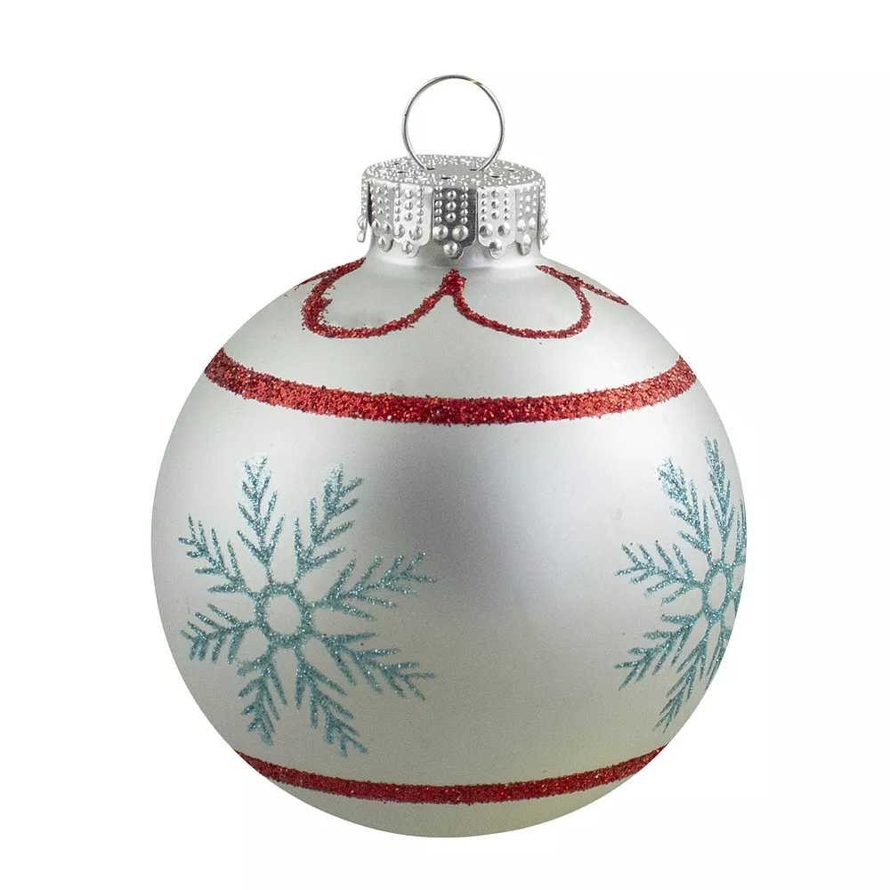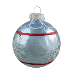 Welcome the winter season to your holiday decor with these glitter snowflake ornaments. These silver and blue ornament balls will add pops of color and a touch of sparkle. This pack will allow you to build your collection and decorate with more possibilities. Product Features: 4-piece set. Color: silver blue red and white. Finish: matte and shiny. Features two glittery blue snowflake designs on a silver matte ornaments. Features two glittery white snowflake designs on shiny blue ornaments. All are accented with red glitter stripes and flower-like designs on the top and bottom. Balls are equipped with silver ornament caps (ornament hooks are not included). Dimensions: 2.75 (70mm) diameter. Material(s): glass/metal/glitter