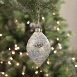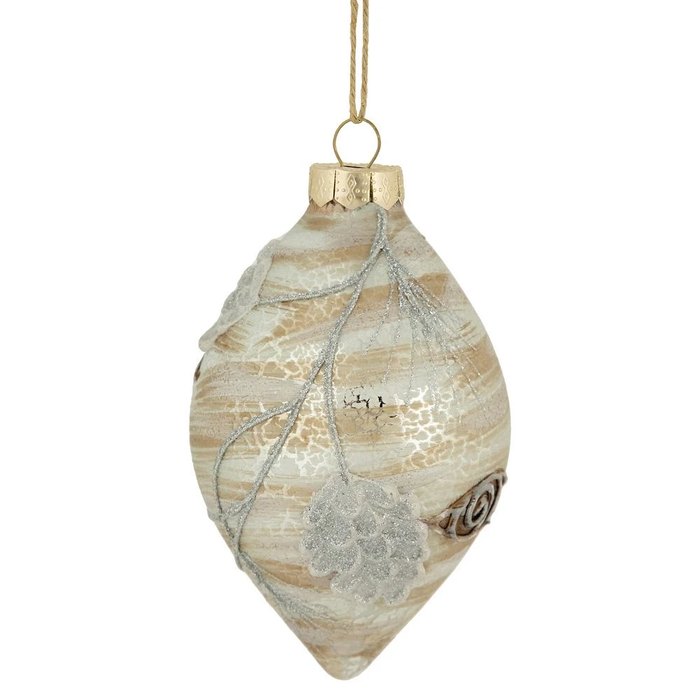 This finial ornament will bring holiday cheer to your Christmas decor with its exquisite details and beautiful faux birch wood crackle finish. Makes a great addition to a country rustic scene. Product Features: Birch finial Christmas ornament. Features glittered pine cones and crackle finish. Fully dimensional ornament. Comes ready-to-hang on a jute cord. Dimensions: 5 high x 3.25 in diameter. Material(s): glass