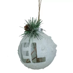 A simplistic nod to Christmas the Noel holly and berry ornament celebrates classic traditions of the season. Features a white frosted glass ball ornament with the word NOEL the best part is you can see directly through the ornament where lies artificial twigs. Pine cones and needles top off this amazing ornament. Perfect for your tree season after season. Product Features: Reads NOEL. Brown branch design. Frosted with large glitter flakes. Pine needle and pine cone accents. Comes ready to hang on a jute cord. For indoor use only. Dimensions: 5H x 4W x 4D. Materials: Glass/plastic