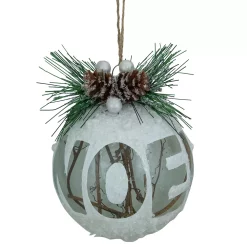 A simplistic nod to Christmas the Noel holly and berry ornament celebrates classic traditions of the season. Features a white frosted glass ball ornament with the word NOEL the best part is you can see directly through the ornament where lies artificial twigs. Pine cones and needles top off this amazing ornament. Perfect for your tree season after season. Product Features: Reads NOEL. Brown branch design. Frosted with large glitter flakes. Pine needle and pine cone accents. Comes ready to hang on a jute cord. For indoor use only. Dimensions: 5H x 4W x 4D. Materials: Glass/plastic
