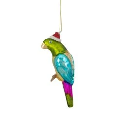 Squawk Polly says Merry Christmas! Bring in the holidays with this adorable green and blue parrot. Sitting in his Santa Hat with his pearlescent body he is sure to add some sparkle and shine to your tree. Whether you add this to your home use this at your themed occasions or give it as a gift this is a perfect enhancement! Product Features: Glass parrot Christmas ornament. Wears a red and white Santa hat. Olive green head and tail. Turquoise colored wings and back. Shiny silver beak. Yellow chest and belly. Perched in a brown stick. Magenta highlights on the edges of the tail. Fully dimensional ornament. Comes ready to hang on a gold cord. Recommended for indoor use only. Dimensions: 6.25H x 2.25W x 2D. Material(s): glass