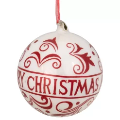 This ornament from the Merry Little Christmas collection will look add a touch of ornate flair your tree! This ornament features a white glass ball with red text and design. This would look amazing on your tree and would look stunning with white silver or even red decor. This ornament is so lovely it would also make a great gift! Product Features : Color: red and white. Reads the scripts Merry Christmas. Design includes ornate filigree pattern on all sides of the ornament. Fully dimensional ornament. Recommended for indoor decorative use only. Comes ready to hang on a red ribbon. Dimensions: 6 diameter. Material(s): glass