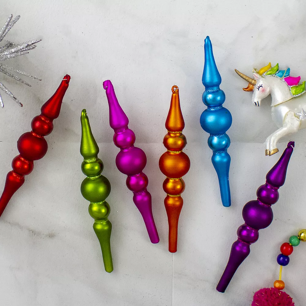Bring home these matte glass finial ornaments to add a sparkle to your decorations. The chic and trendy designs will complement any decor scheme. Brighten up your hallways or porch with these bright pops and begin the festivities in style. Product Features: 6-piece set. Color: orange pink red purple blue and green. Finish: matte. Each accented with it’s own color of glitter. Finials are equipped with a 3 inch silver ornament loops. Dimensions: 6.25 high x 1 diameter. Material(s): glass/metal/rope