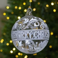 Are you looking for an elegant take on a Christmas classic? This ornament features a bright glass ball with white text and design. It would look amazing on your tree and would look stunning with any decor. This ornament is so lovely and it would also make a great gift! Product Features : White and clear glass ball ornament. Reads “Merry Christmas. Features a clear glass ball with white designs. Design includes ornate white filigree and text. Fully dimensional ornament. Recommended for indoor use only. Dimensions: 6 diameter. Material(s): glass